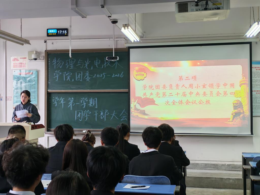 为凝聚团学干部力量、明确近期工作重点,2025年10月29日下午,ok138cn太阳集团团委于石鼓校区综合楼506教室召开2025-2026学年第一学期团学干部大会。学院党委副书记李建鹏、学院团委负责人周小玄以及全体团学干部参会。会议由学院团委副书记党嘉莹主持。